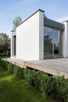 extérieur : enduit blanc sur isolant - châssis double vitrage en afzélia - bardage afzélia - capot zinc prépatiné - murets en béton préfabriqués - dalle de béton lissée - terrasse en afzélia